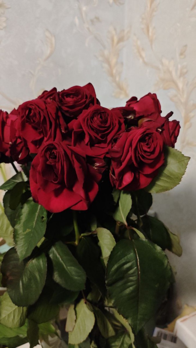 К сожалению, цветы могут быстро терять свежесть, особенно если помещение слишком тёплое или не обладает хорошей вентиляцией. Розы — очень чувствительные растения,они могут завянуть быстрее, несмотря на все наши усилия по уходу и доставке. Мы всегда стараемся обеспечить максимально свежие и красивые букеты.Именно таким он и уехал на доставку,к сожалению далее нам неизвестно,что происходит с букетом,как за ним ухаживают и т.д.Со своей стороны так же прикрепляем фото букета.