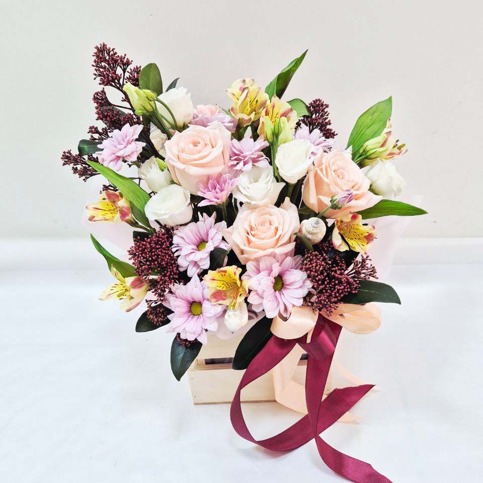 Насладитесь изысканной композицией из живых цветов, где нежные розы Кимберли солируют в окружении альстромерий, хризантем, эустом и гвоздик. Эта цветочная композиция – воплощение свежести и элегантности, идеальный подарок для любого случая. Состав композиции тщательно подбирается нашими флористами, чтобы создать гармоничное сочетание форм и оттенков. Возможны изменения в зависимости от наличия товара, но мы гарантируем, что каждая композиция будет уникальной и восхитительной.